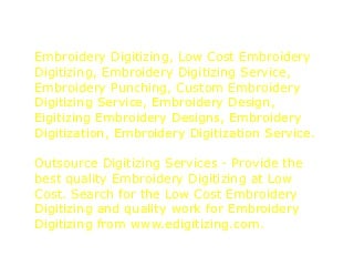 The modern day machines employ software to create unique, creative and innumerous embroidery digitizing company and stitch patterns. The method is also significantly less time consuming, produces heavy embroidery designs at minimum price and enables revolutionary style of embroidery. Clothing lines have employed the machine embroidery services offered by several organizations because with digitization of embroidery the demand for such clothes for children, men and women have gone up steadily. Besides, digitized versions of embroidery patterns also can be downloaded from the World wide web or purchased on-line to utilize them inside your own clothes lines. You’ll find also many machine embroidery manufactures who sell their styles and patterns that can be used to make beautiful embroidered garments.